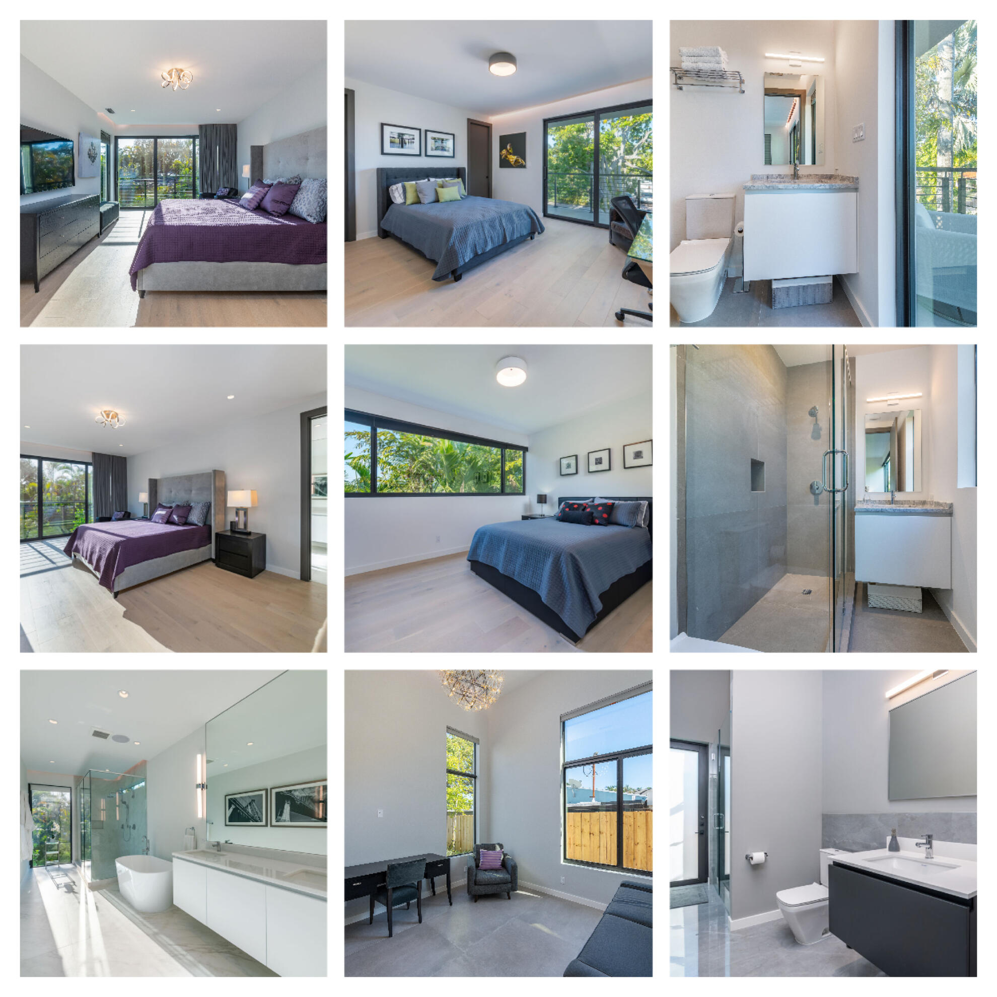 There are 3 bedrooms on the second floor: the "Master" with a king bed, 65" TV, dresser, closet, ensuite bath with double vanities, soaker tub & double shower; the "Middle" bedroom with a queen bed, 55" TV, dresser, closet, ensuite bathroom; the "Front" bedroom with a queen bed, desk, chair, dresser, closet, patio area, ensuite bathroom. The fourth bedroom/office is on the main floor with a queen sofa bed, desk, chair, closet and adjacent bathroom.